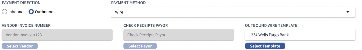 - In the new UI, the interface takes advtange of enabled and disabled component states, so the Vendor Invoice Number, Check Receipts Payor, and Outbound Wire Template fields will enabled or disabled based on the selections.
